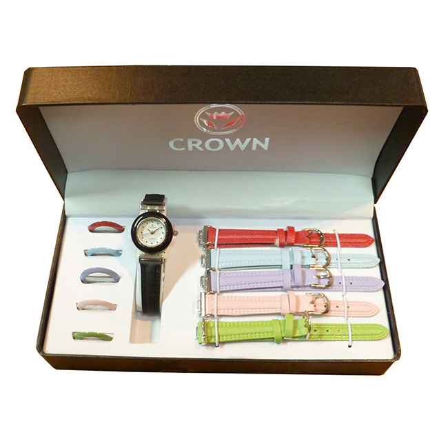 Set de Relojes Estuche de color Negro Reloj CROWN Malla de Cuero Con aros y malla intercambiables